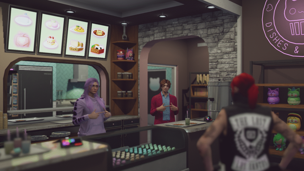 I also decided it was an opportunity to do something I had never done before – work in a food business. Proto-Riley had worked at Burger Shot, after all. For real, though, I aimed for a job at the UwU Cat Cafe – where I had watched Danni work for so long and had also been quite sad to blow up during the Savala Strikes storyline having been such an iconic location.